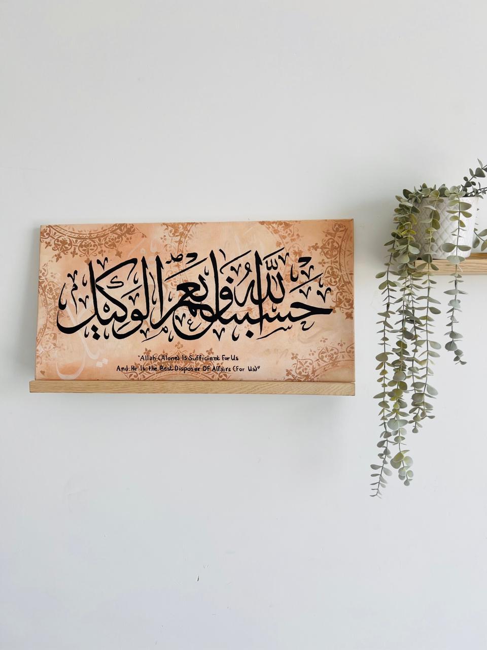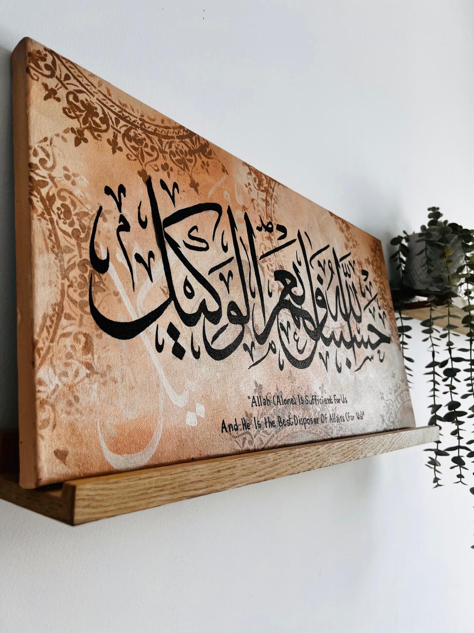 Set against a soft beige background symbolizing serenity and humility, this painting features the powerful Quranic phrase حسبنا الله و نعم الوكيل “Allah is sufficient for us, and he is the Best Disposer of affairs.”