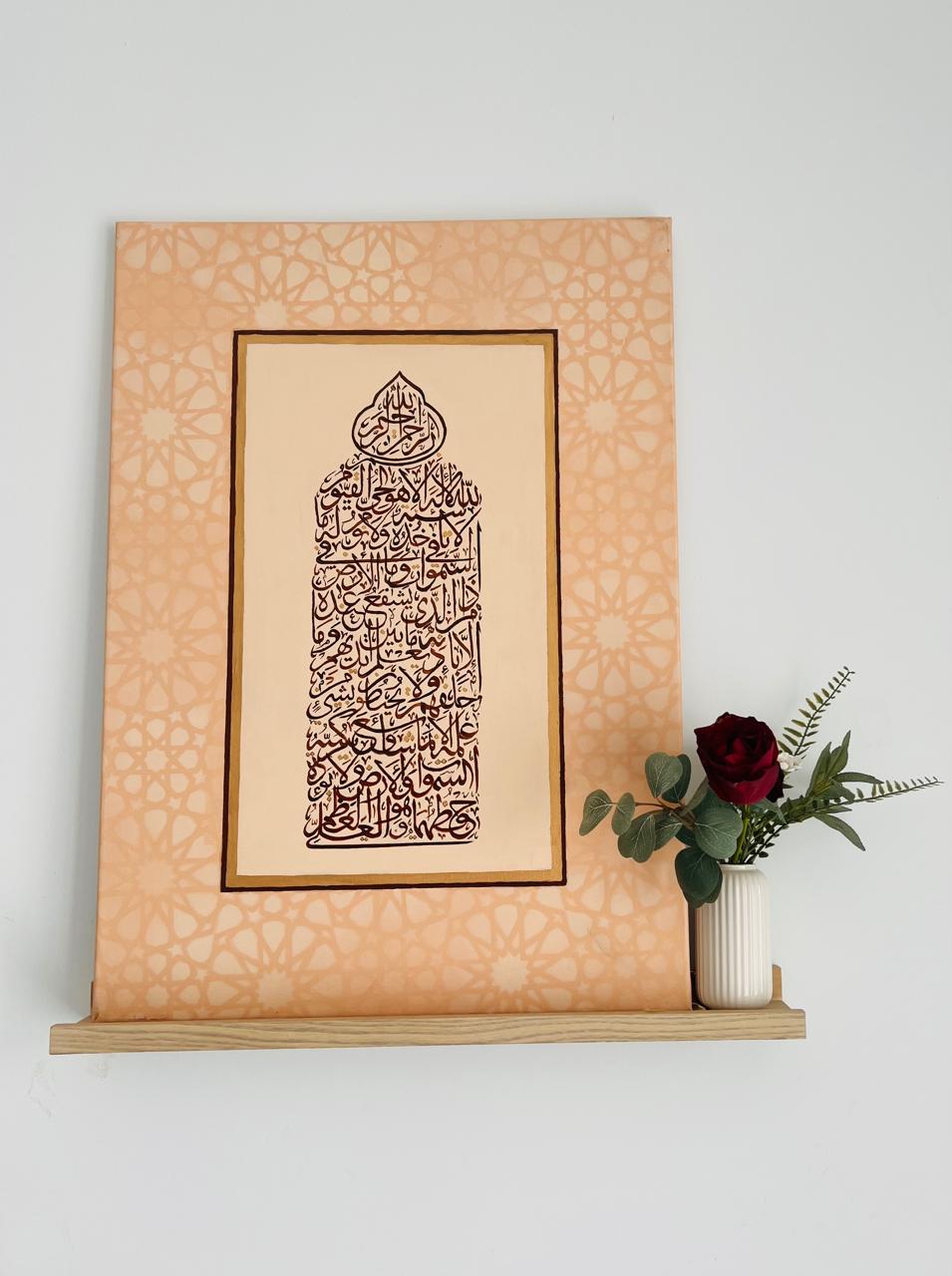This handmade artwork features the revered verse Ayatul Kursi (Qur’an 2:255), beautifully written in Arabic calligraphy within a mehrab-inspired design. The calligraphy is rendered on a soft beige peach canvas, bordered with geometric patterns that echo traditional Islamic architecture. The harmonious blend of text and design creates both a spiritual and aesthetic presence, making it a timeless reminder of Allah’s protection and power.